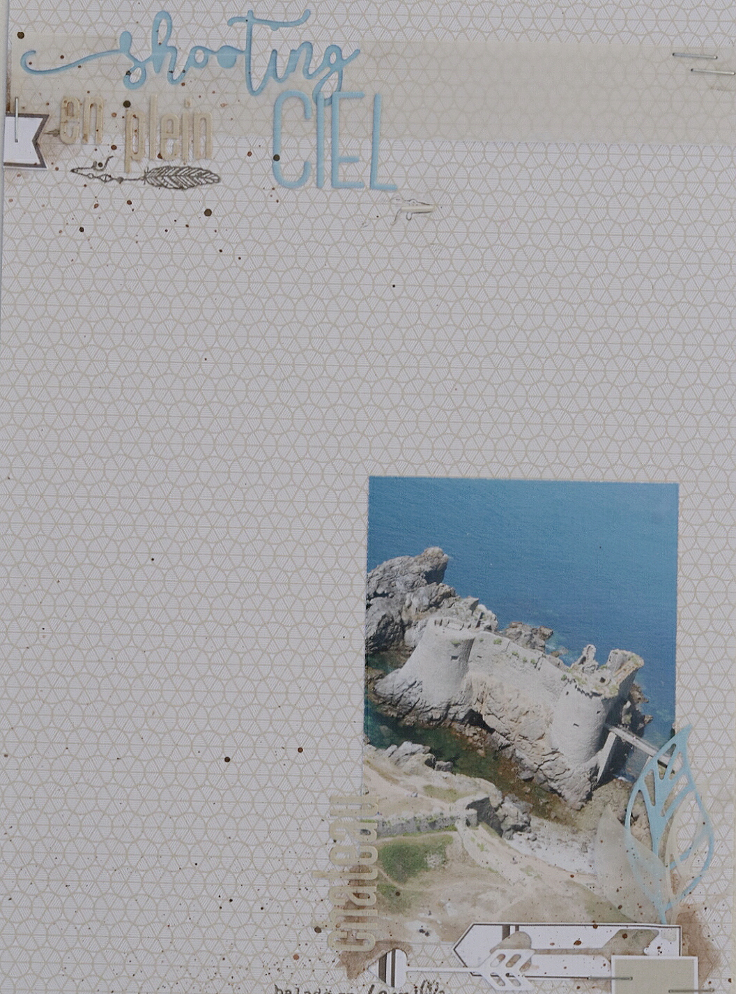Pour celle-ci je me suis pas mal amusée avec des découpes : j'ai utilisé un dies Swirlcard pour découper directement le mot "Shooting" dans mon fond de page, Un alphabet Simply Grpahic pour le mot ciel, et j'ai joué aussi avec les dies de la fée autour de la photo.